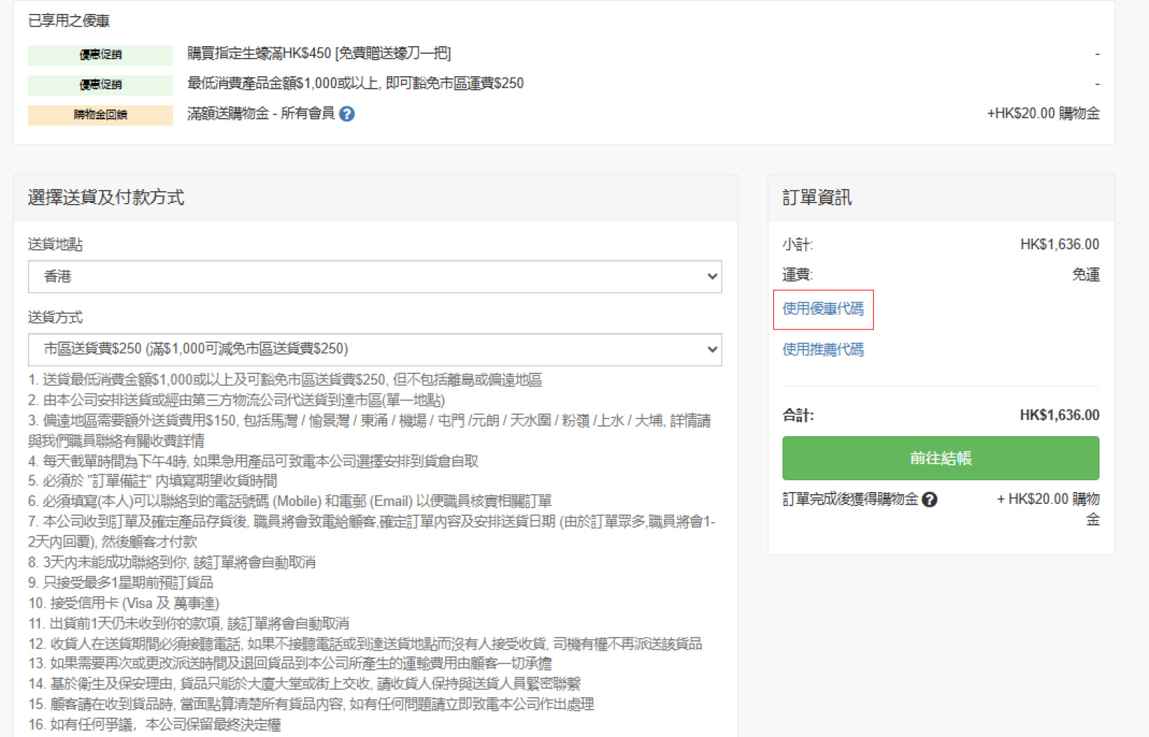 - 顧客必須於網上購物結帳時在「使用優惠代碼」一欄中輸入此優惠代碼方可兌現。